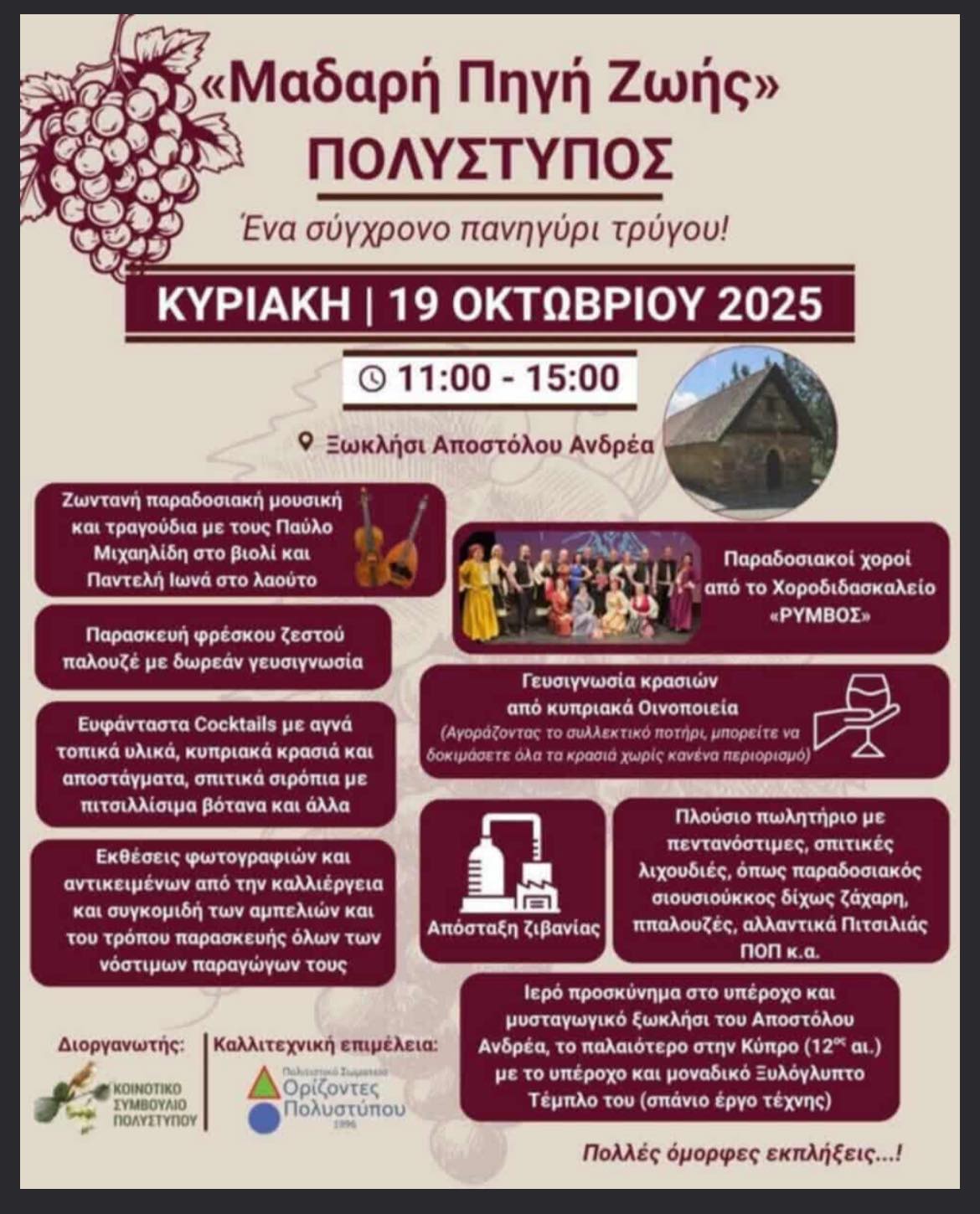 2/ Στο πλαίσιο του φεστιβάλ του Πολυστύπου θα μπορούμε επίσης να απολαύσουμε αρκετά ποιοτικά κυπριακά κρασιά από ορισμένα εκ των καλύτερων οινοποιείων από όλη την Κύπρο. Συγκεκριμένα, αγοράζοντας το συλλεκτικό ποτήρι της εκδήλωσης, θα μπορούμε να δοκιμάσουμε όλα ανεξαιρέτως τα κρασιά χωρίς κανέναν περιορισμό. Εκεί θα βρεθούν το Οινοποιείο Βλασίδης (Κοιλάνι, Κρασοχώρια Λεμεσού), το Οινοποιείο Κυπερούντας (Κυπερούντα, επ. Λεμεσού), το Κτήμα Δαφέρμου (Πάνω Λεύκαρα, επ. Λάρνακας), το οινοποιείο Πόβης (Άγιος Επιφάνιος, επ. Λευκωσίας), το οινοποιείο Άης Αμπέλης (Καλό Χωριό Ορεινής, επ. Λευκωσίας), το οινοποιείο Ezousa (Κανναβιού, επ. Πάφου), το Nelion (Πραιτώρι, επ. Πάφου), το οινοποιείο Ξενοφώντος-Μεθυναίος (Κυπερούντα, επ. Λεμεσού), ενώ ενδέχεται επίσης να συμμετάσχει τα οινοποιείο Ayia Mavri (Κοιλάνι, Κρασοχώρια Λεμεσού). Στο χωριό μάλιστα θα βρεθούν και ορισμένοι από τους παραγωγούς, όπως για παράδειγμα ο Σοφοκλής Βλασίδης, ο οποίος αναμφισβήτητα αποτελεί έναν εκ των κορυφαίων παραγωγών κρασιού στον τόπο μας.