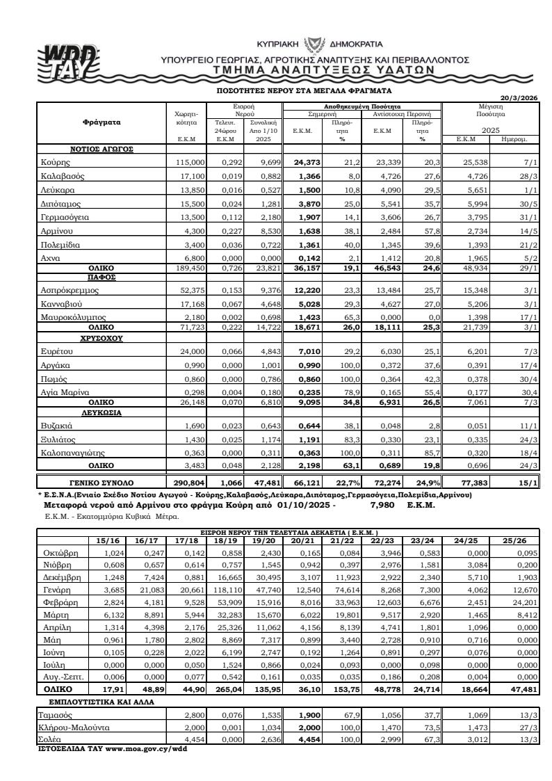 Παράλληλα, "η εισροή νερού στα φράγματα κατά το τελευταίο 24ωρο ανήλθε στα 1.066 Ε.Κ.Μ νερού. Η συνολική πληρότητα των φραγμάτων ανέβηκε στο 22.7% την Παρασκευή (20/03/2026) από το 22.4% που ήταν μέχρι το πρωί της Πέμπτης (19/03/2026) ενώ την αντίστοιχη περσινή ημέρα ήταν στο 24.9%".