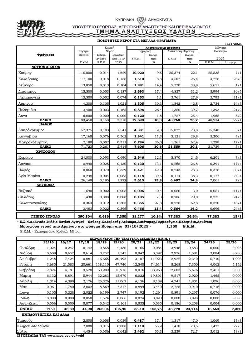 Ωστόσο, σύμφωνα με τα στοιχεία του Τμήματος Αναπτύξεως Υδάτων κανένα από τα μεγάλα φράγματα δεν έχει υπερχειλίσει μέχρι στιγμής.