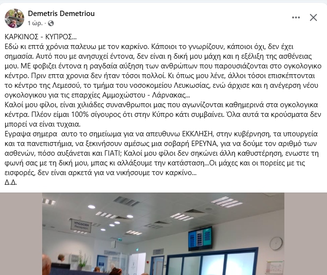 Τι τον φοβίζει; Όπως σημειώνει στην ανάρτησή του, έχοντας εμπειρία επτά χρόνων, είναι ραγδαία η αύξηση των ανθρώπων που παρουσιάζονται στο ογκολογικό κέντρο. «Καλοί μου φίλοι, είναι χιλιάδες οι συνάνθρωποί μας που αγωνίζονται καθημερινά στα ογκολογικά κέντρα. Πλέον είμαι 100% σίγουρος ότι στην Κύπρο κάτι συμβαίνει. Όλα αυτά τα κρούσματα δεν μπορεί να είναι τυχαία. Απευθύνω έκκληση να ξεκινήσουν αμέσως μια σοβαρή έρευνα».