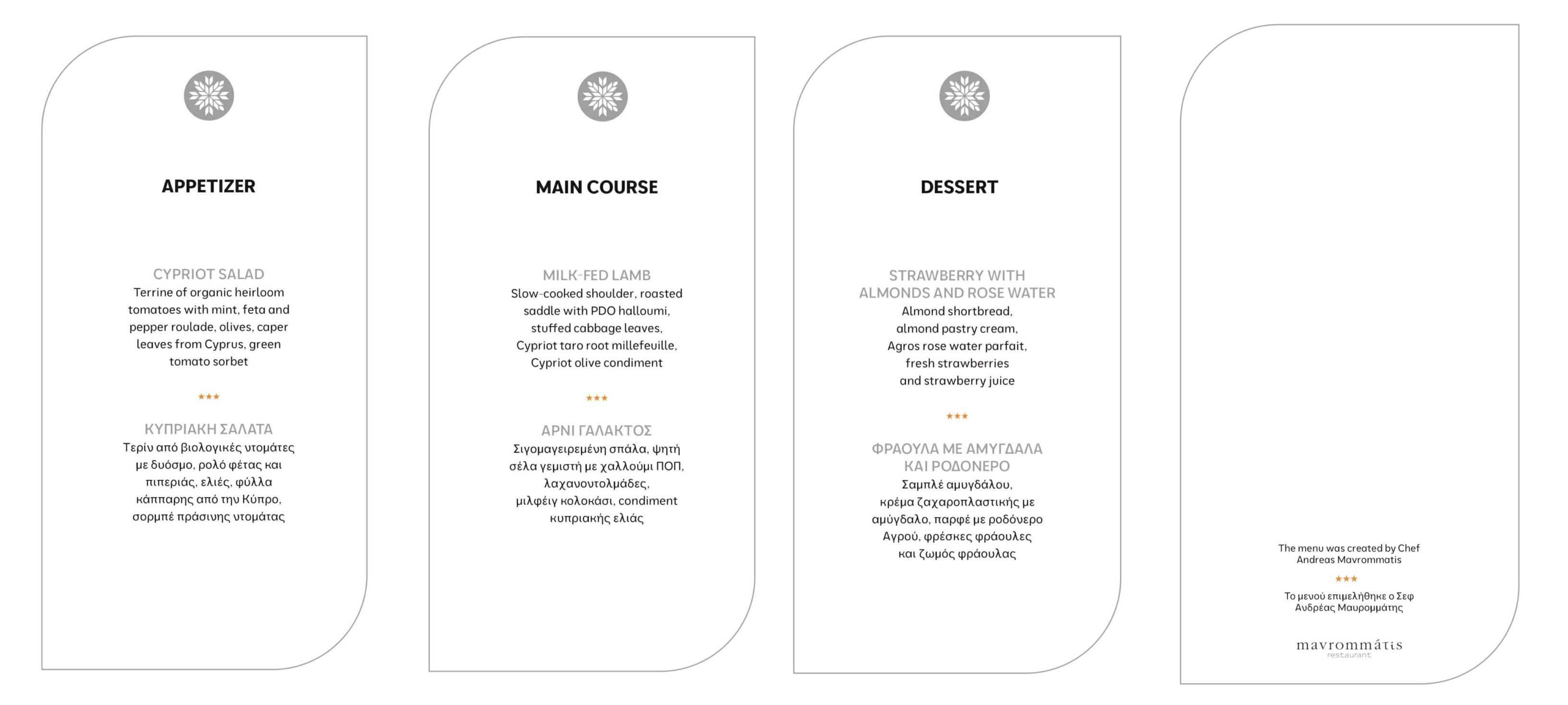 Πάνω σε όλα τα μενού, υπάρχει η σημείωση ότι «τo μενού επιμελήθηκε ο Σεφ Ανδρέας Μαυρομμάτης», ενώ υπάρχει επίσης και το λογότυπο του εστιατορίου στο Παρίσι.