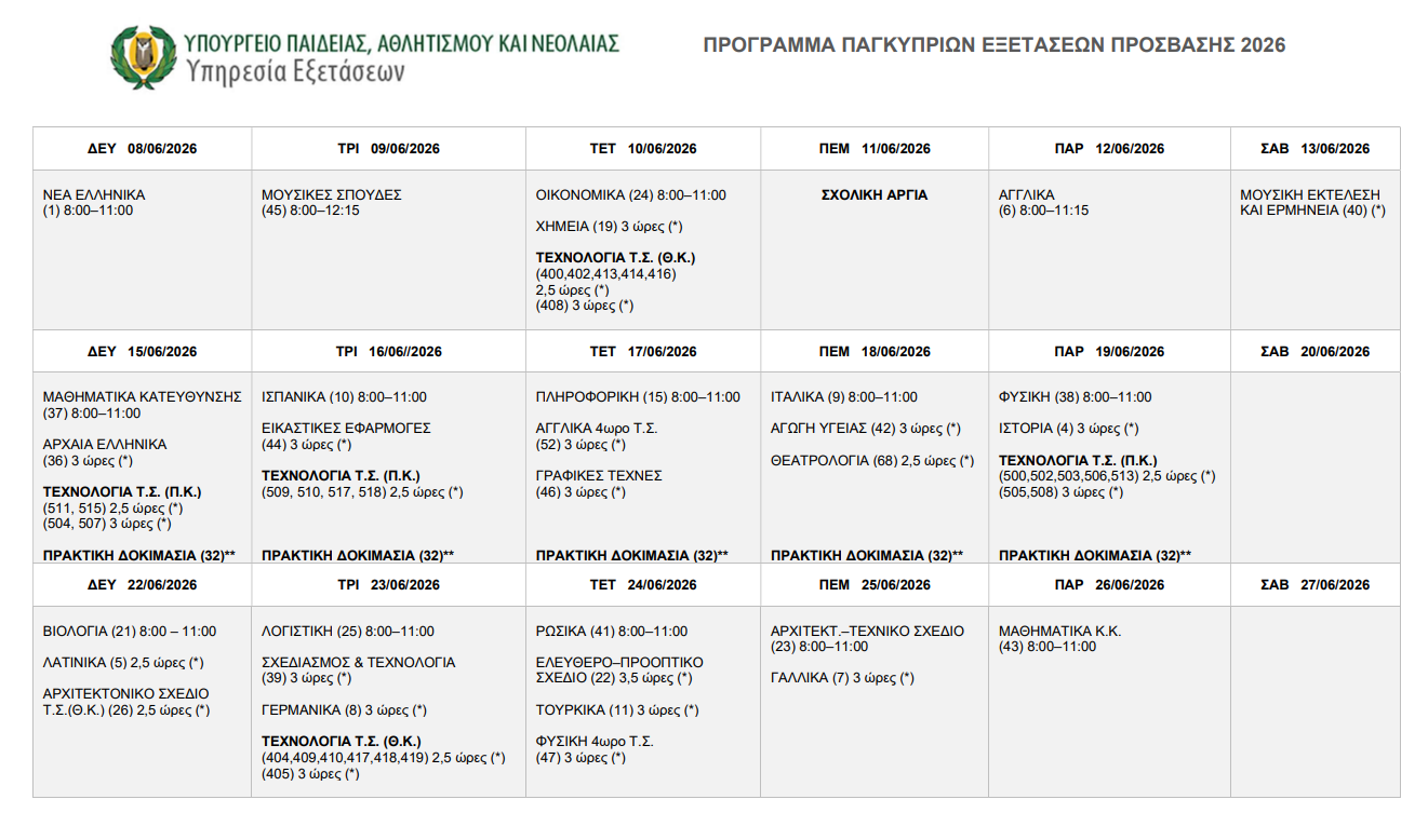 Oι Παγκύπριες Εξετάσεις Πρόσβασης 2026 αρχίζουν στις 8 Ιουνίου και ολοκληρώνονται στις 26 Ιουνίου 2026.