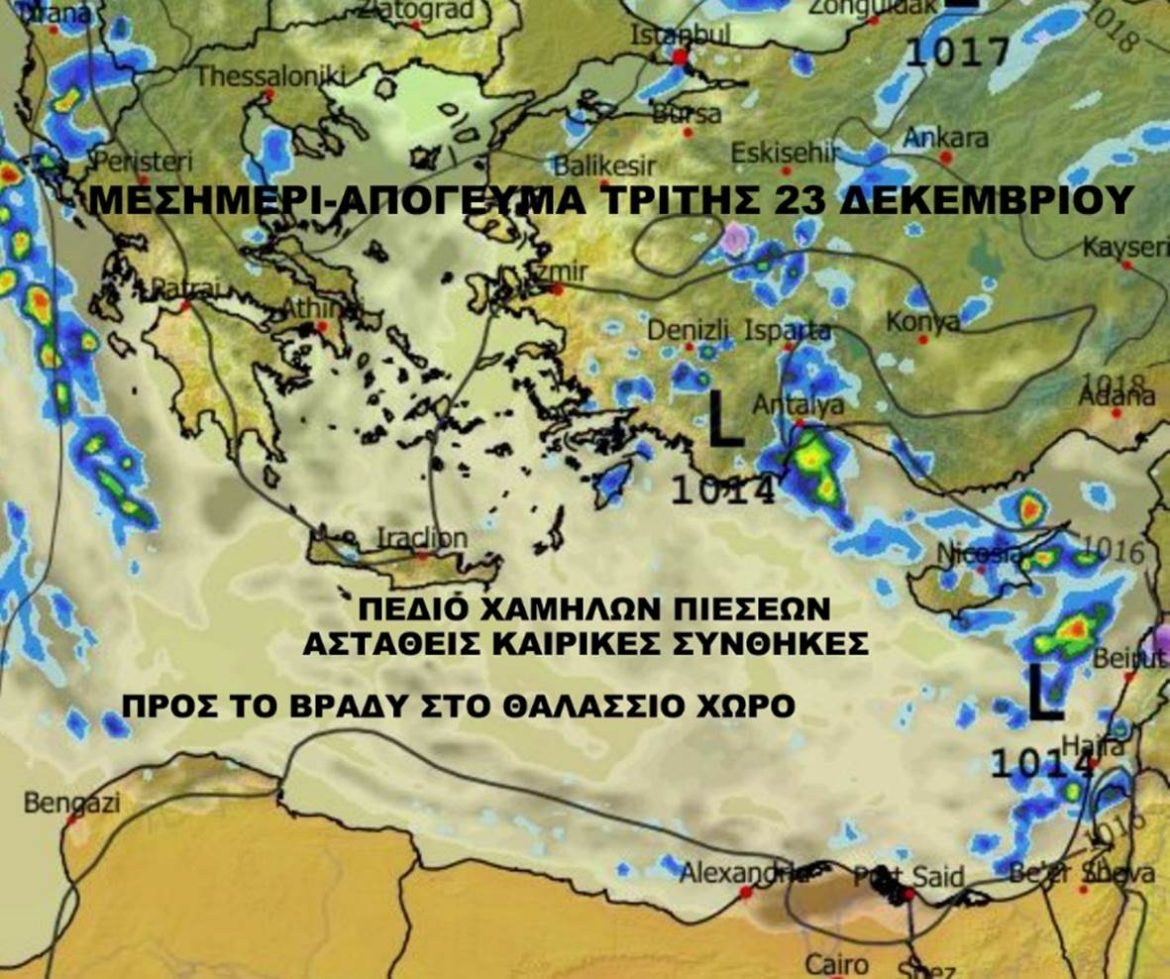 Χριστούγεννα μέγιστες θερμοκρασίες χωρίς ιδιαίτερη μεταβολή και θα είναι στο εσωτερικό και παράκτιες περιοχές στους 19-20 βαθμούς. Στα ορεινά μεταξύ 8-14 βαθμούς. Θερμοκρασίες κοντά στις κανονικές έως ελαφρώς πάνω.. Βορειοδυτικό-Βορειοανατολικό ρεύμα αέρα στα 2 έως 3 μποφόρ. Ηλιοφάνεια με παροδικές νεφώσεις τοπικά αυξημένες κυρίως μεσημέρι και απόγευμα με πιθανότητα τοπικών βροχών στα ορεινά-ημιορεινά και προς εσωτερικό μετά τις 14:00.