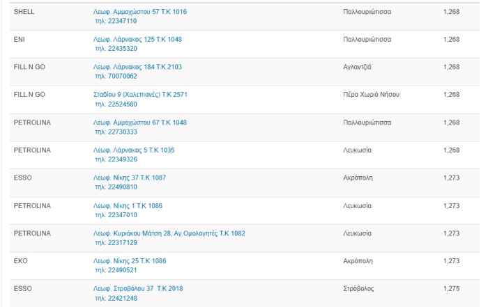 Σύμφωνα με το παρατηρητήριο τιμών, της κυβερνητικής Υπηρεσίας Προστασίας Καταναλωτή, το μεσημέρι του Σαββάτου (7/3), η λιανική πώληση της βενζίνης και του diesel από τα πρατήρια στις ελεύθερες περιοχές της Κύπρου, είχε τα εξής χαρακτηριστικά: