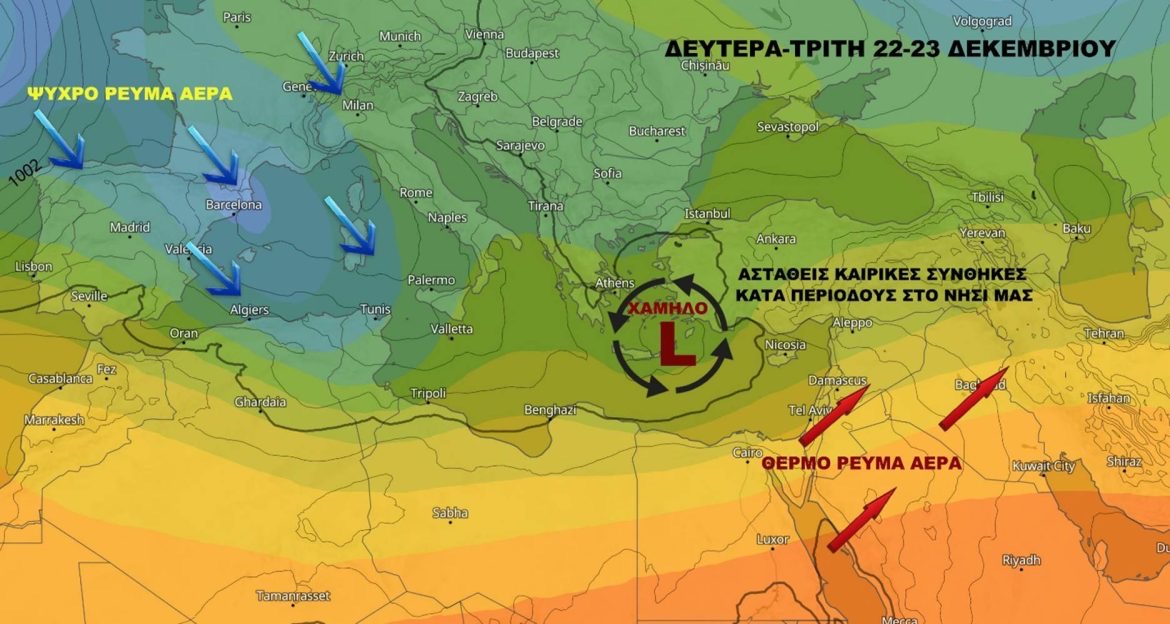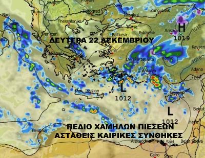 "Κατά την διάρκεια της ημέρας Δευτέρα 22 Δεκεμβρίου τοπικού χαρακτήρα βροχές διάσπαρτα στο νησί αλλά δεν θα επηρεαστούν αρκετές περιοχές. Όμως από αργά το βράδυ Δευτέρας κοντά στα μεσάνυχτα προς Τρίτη μέχρι και αργά το μεσημέρι νέα ατμοσφαιρική διαταραχή θα επηρεάζει την περιοχή μας με βροχές σε αρκετές περιοχές. Βροχές έως μέτριας ένταση και πιο τοπικά να είναι έντονη η βροχή.