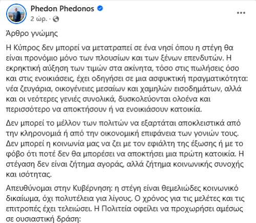 Η Κύπρος δεν μπορεί να μετατραπεί σε ένα νησί όπου η στέγη θα είναι προνόμιο μόνο των πλουσίων και των ξένων επενδυτών, σημειώνει ο δήμαρχος Πάφου, Φαίδωνας Φαίδωνος, σε ανάρτησή του στα social media.