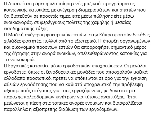 Μαζική ανέγερση φοιτητικών εστιών. Στην Κύπρο φοιτούν δεκάδες χιλιάδες φοιτητές, πολλοί από το εξωτερικό. Η ύπαρξη οργανωμένων και οικονομικά προσιτών εστιών θα απορροφήσει σημαντικό μέρος της ζήτησης στην αγορά ενοικίων, απελευθερώνοντας κατοικίες για τα νοικοκυριά.