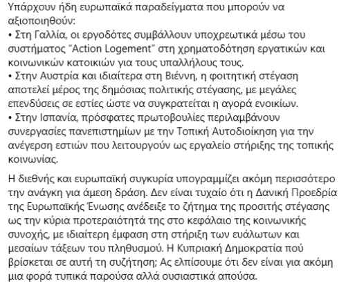 Στο άρθρο γνώμης που δημοσίευσε, αγγίζει επίσης, με προβληματισμό, την εξής πραγματικότητα: «Δεν μπορεί το μέλλον των πολιτών να εξαρτάται αποκλειστικά από την κληρονομιά ή από την οικονομική επιφάνεια των γονιών τους. Δεν μπορεί η κοινωνία μας να ζει με τον εφιάλτη της έξωσης ή με τον φόβο ότι ποτέ δεν θα μπορέσει να αποκτήσει μια πρώτη κατοικία. Η στέγαση δεν είναι ζήτημα αγοράς αλλά ζήτημα κοινωνικής συνοχής και ισότητας».