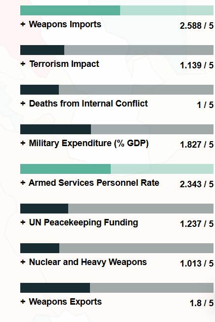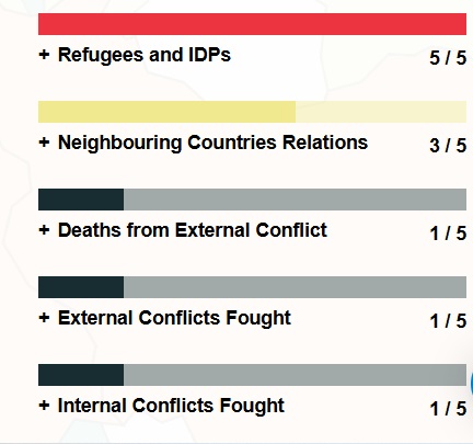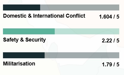 Η παγκόσμια ειρήνη επιδεινώνεται κάθε χρόνο από το 2014, ενώ αυτή τη στιγμή υπάρχουν 59 ενεργές συγκρούσεις, οι περισσότερες από το τέλος του Β' Παγκοσμίου Πολέμου, με 152.000 θανάτους.