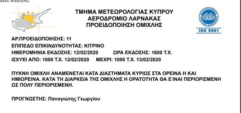 Κίτρινη προειδοποίηση εξέδωσε η Μετεωρολογική Υπηρεσία Κύπρου λόγω της πυκνής ομίχλης που θα σημειωθεί στα ορεινά και ημιορεινά.
