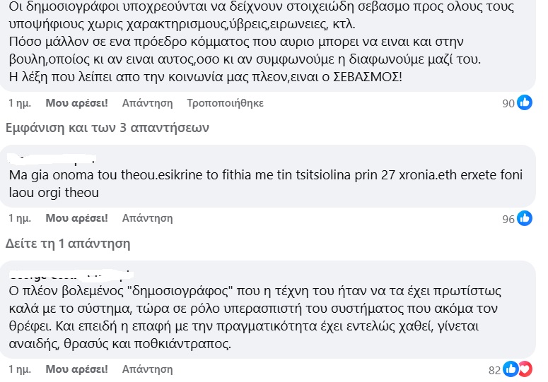 Ας το έχουν αυτό υπόψη τους και οι δυο πλευρές." Κάτω από την ανάρτηση υπήρξαν πολλές επικριτικές φωνές με τον παλιό δημοσιογράφο του ΡΙΚ, Σπύρο Κέττηρο να γράφει "Ρίχνεις αυγά στον τοίχο".
