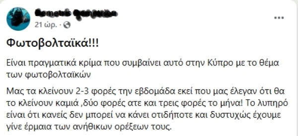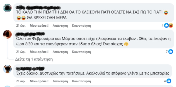 Κάποιοι λένε πως «μας το κόβουν 2-3 φορές την εβδομάδα» ενώ άλλοι γράφουν για «4-5 μέρες την εβδομάδα». Οι περισσότεροι, με βάση τις αναρτήσεις τους, έχουν σχηματίσει την εντύπωση πως παρεμποδίζεται η απερίσπαστη παραγωγή ενέργειας από φωτοβολταϊκά για ιδία κατανάλωση του υποστατικού.