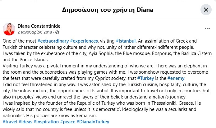 Στις 2 Ιανουαρίου του 2018, η Νταϊάνα Κωνσταντινίδη, σε ανάρτησή της στα social media, για τις εντυπώσεις της «από την επίσκεψη στην Istanbul», όπως έγραψε, σημείωσε μεταξύ άλλων και τα ακόλουθα: