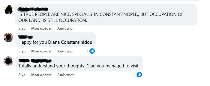 Το μόνο σχόλιο από τρίτο πρόσωπο στον οποίο δεν αλληλεπίδρασε, αναφέρει: «Είναι αλήθεια ότι οι άνθρωποι είναι καλά, ειδικά στην Κωνσταντινούπολη, αλλά η κατοχή της γης μας είναι ακόμα κατοχή».