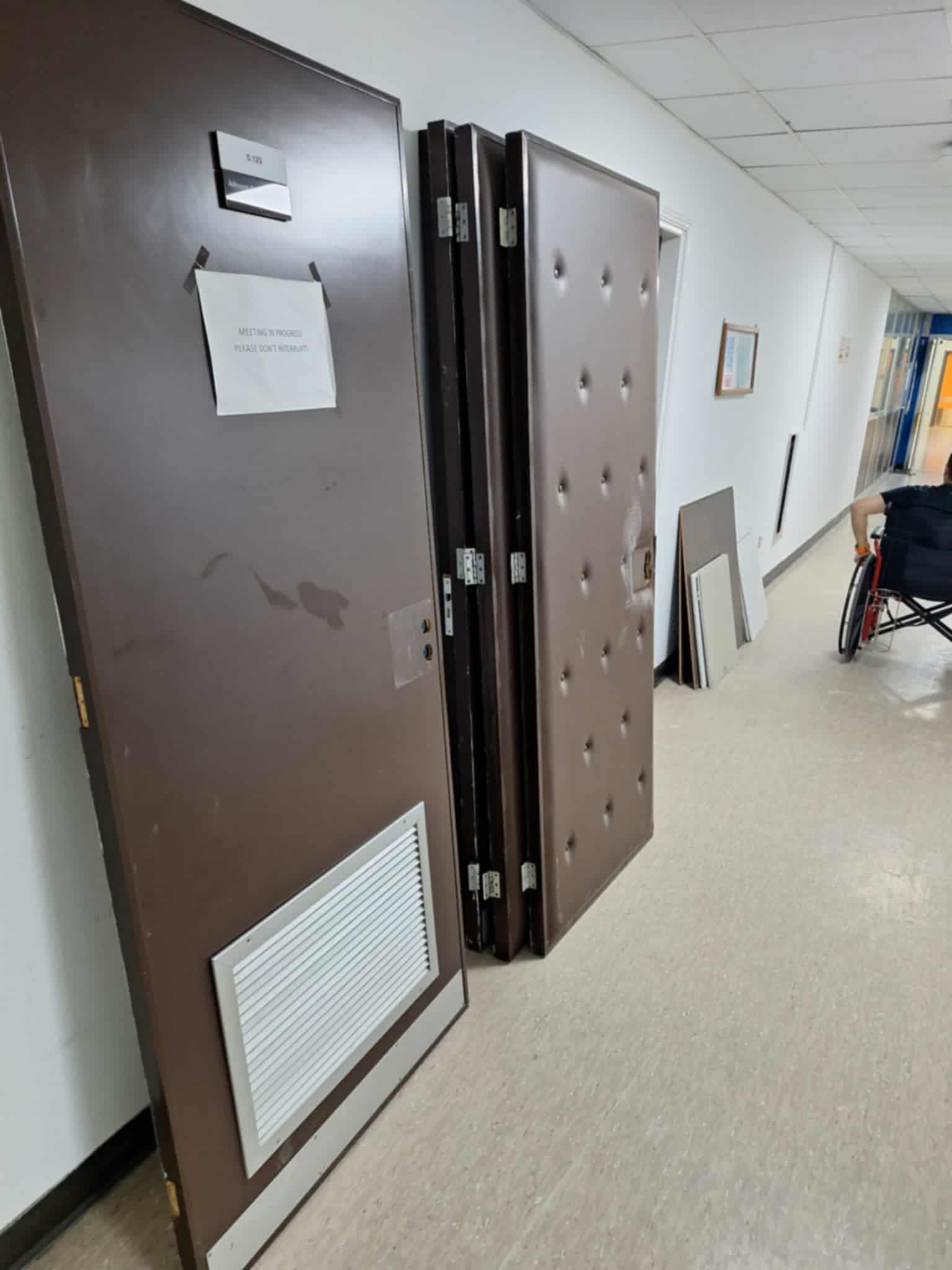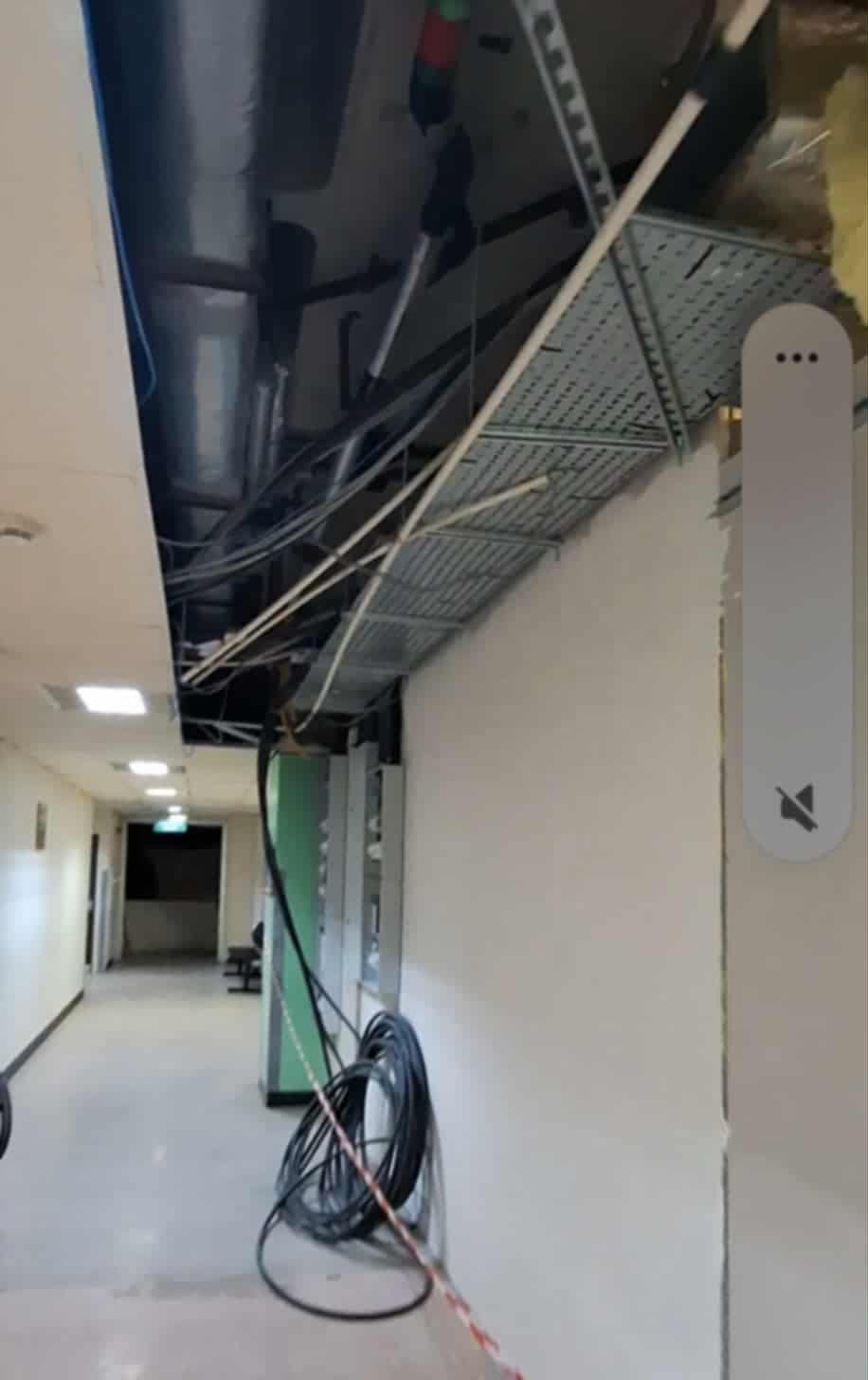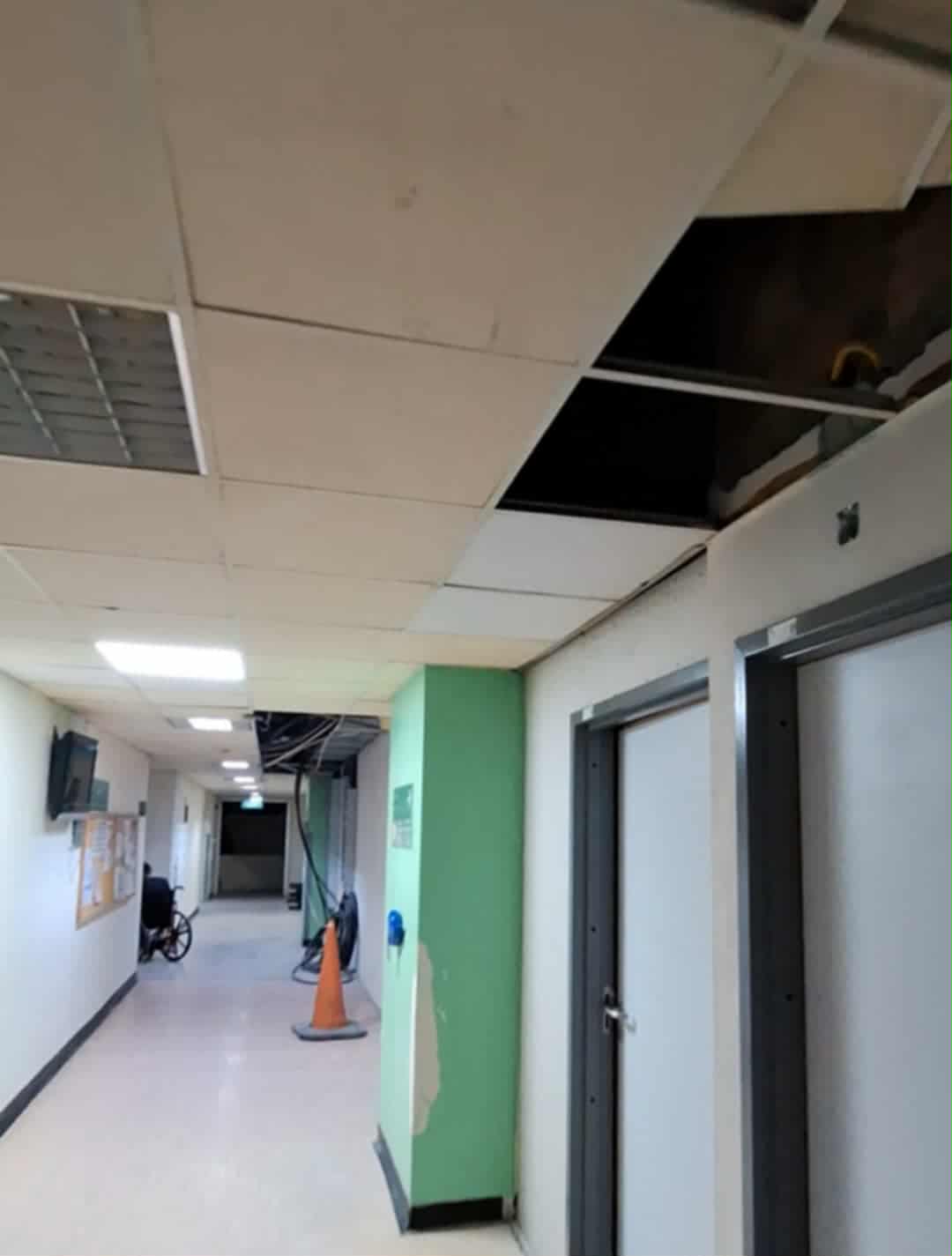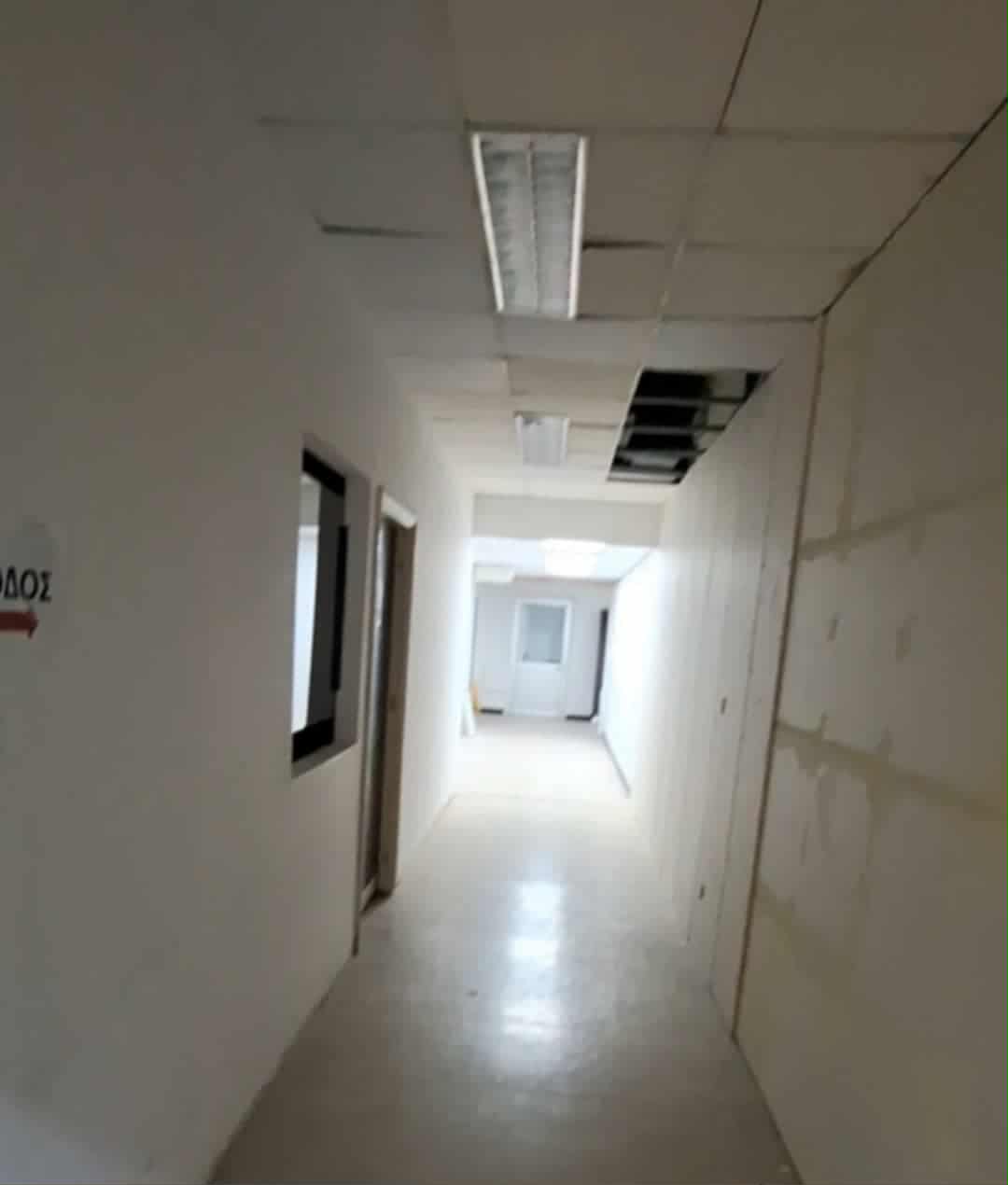 Όπως φαίνεται και στις φωτογραφίες πιο κάτω, η διαδρομή από τα επείγοντα μέχρι το ακτινολογικό, περιλαμβάνει καλώδια βγαλμένα από τους τοίχους, πινακίδες στο πάτωμα, ανοικτά ταβάνια και καμένα φώτα.