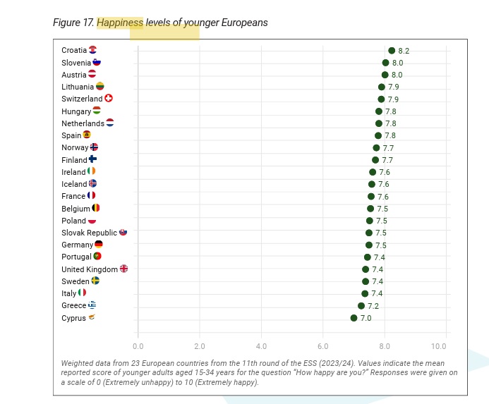 Στο πιο θετικό άκρο της κλίμακας, ορισμένες χώρες της Κεντρικής και Βόρειας Ευρώπης ξεχώρισαν με αξιοσημείωτα υψηλές βαθμολογίες ευτυχίας. Σε αυτές περιλαμβάνονταν η Αυστρία (8,0), η Σλοβενία (8,0) και η Κροατία (8,2) – η υψηλότερη μεταξύ όλων των χωρών που συμμετείχαν στην έρευνα. Ομοίως, οι νέοι στην Ολλανδία και την Ουγγαρία (και οι δύο 7,8) και η Ελβετία (7,9) ανέφεραν επίσης επίπεδα ευτυχίας άνω του μέσου όρου.