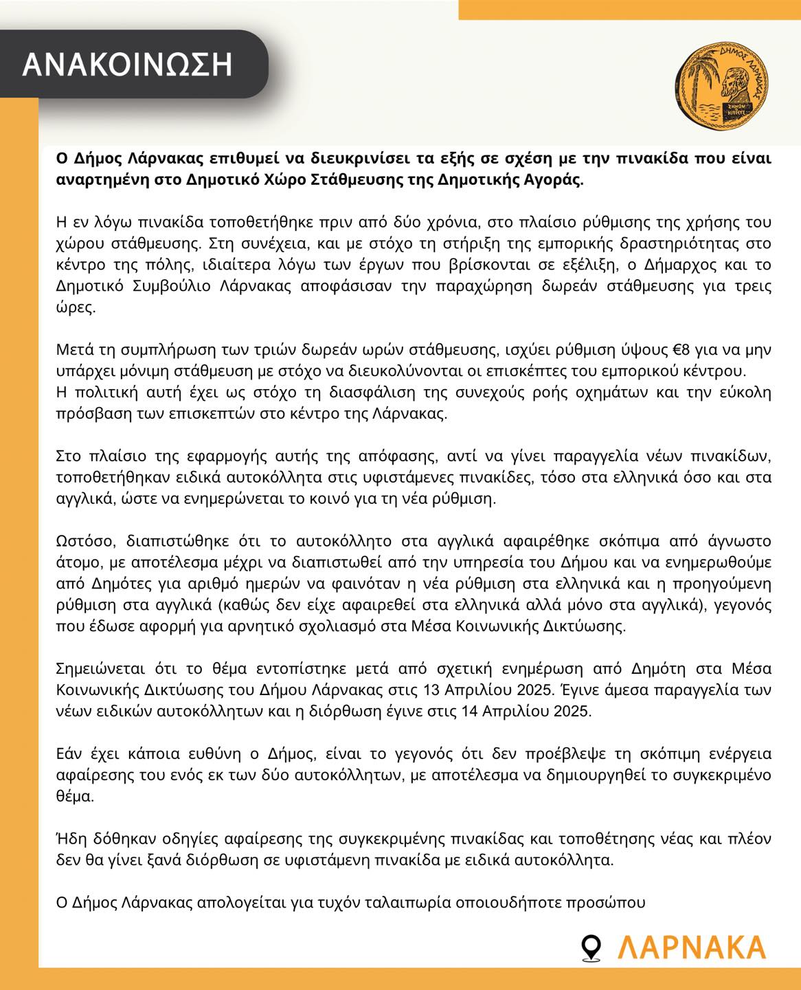 Δείτε την ανακοίνωση από τον Δήμο Λάρνακας: