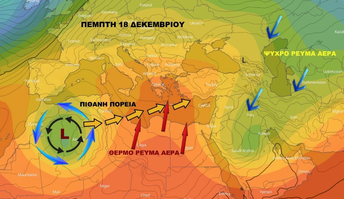 "Πέμπτη 18 Δεκεμβρίου απομακρύνεται περαιτέρω το ψυχρό ρεύμα αέρα από την περιοχή μας και σταδιακά μας προσεγγίζει θερμό ρεύμα αέρα με την θερμοκρασία να σημειώνει άνοδο σε Ελλάδα και Κύπρο. Το ανέβασμα θερμού ρεύματος αέρα οφείλεται στο χαμηλό βαρομετρικό που εισχώρησε σε βορειοδυτική Αφρική για αυτό μπροστά του ανηφορίζει θερμό ρεύμα αέρα.