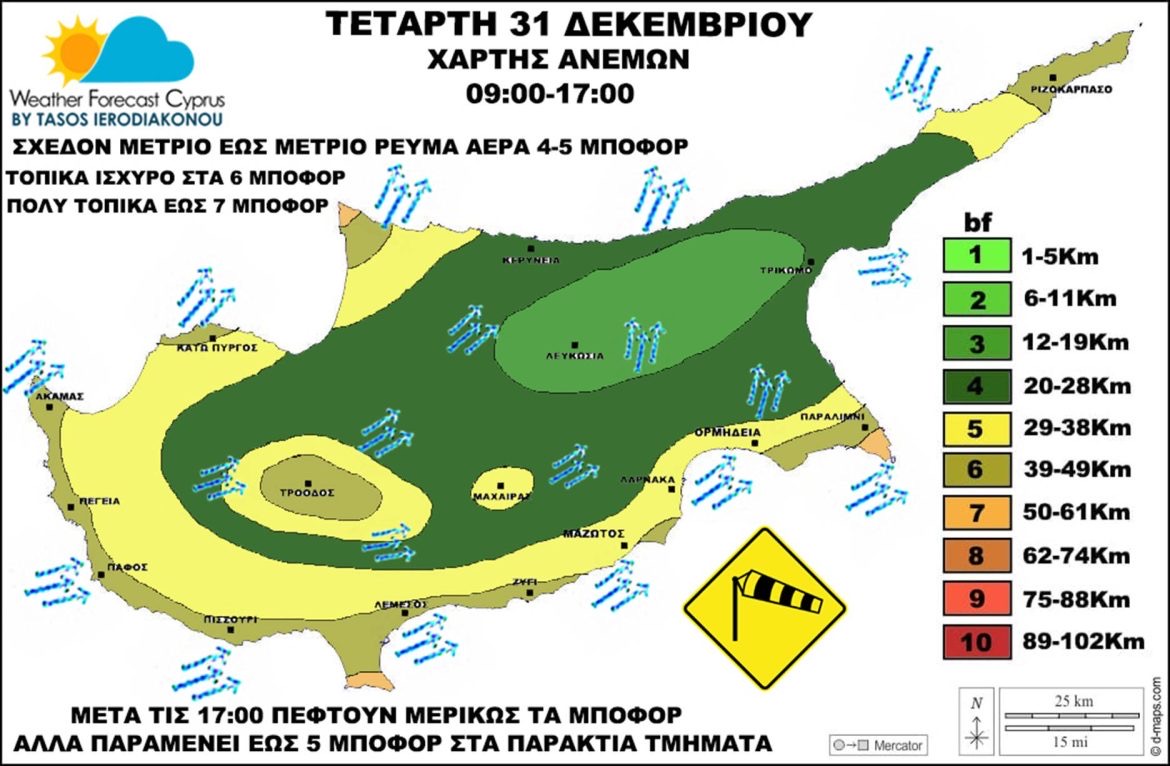 Ενισχυμένο το πεδίο ανέμων κατά την διάρκεια της ημέρας. Σχεδόν μέτριο έως μέτριο ρεύμα αέρα 4 έως 5 μποφόρ μεταξύ των ωρών 09:00-17:00 αλλά σε παράκτια-παράλια και ορεινά έως ισχυρό ρεύμα αέρα στα 6 μποφόρ και πιο τοπικά έως 7 μποφόρ. Μετά τις 17:00 θα αρχίσουν να εξασθενούν σταδιακά τα ισχυρά μποφόρ αλλά παραμένει έως μέτριο ρεύμα αέρα κυρίως στα παράκτια-παράλια τμήματα. Βραδινές ώρες Βόρειο ψυχρό ρεύμα αέρα 2 έως 4 μποφόρ και στα βόρεια έως 5 μποφόρ.