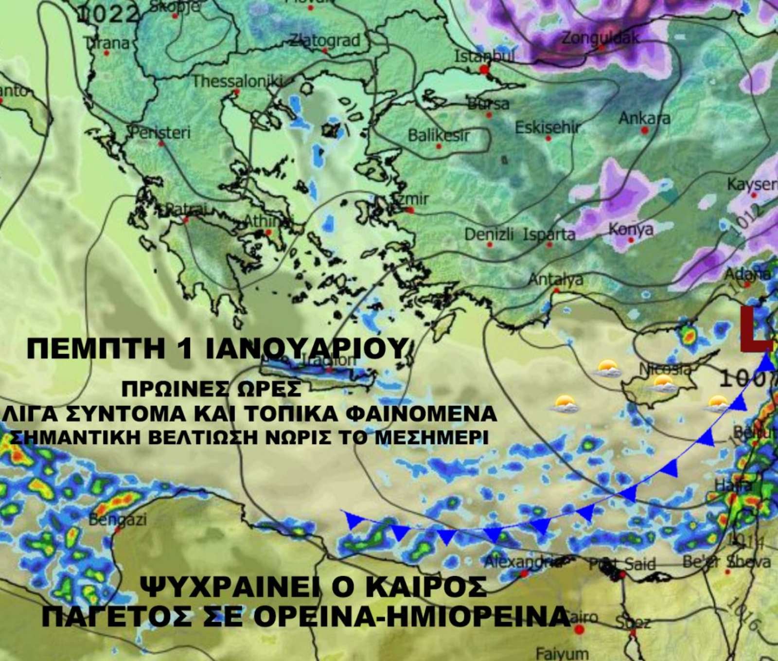 Κατά τις μεσημβρινές ώρες αναμένεται και το πέρασμα του ψυχρού μετώπου με αποτέλεσμα ο άστατος καιρός σε αρκετές περιοχές να συνεχίζεται μεσημέρι και απόγευμα με το χαμηλό βαρομετρικό βόρεια-βορειοδυτικά της Κύπρου. Μεσημέρι προς απόγευμα βροχές σε αρκετές περιοχές έως μέτριας έντασης και πιο τοπικά έως έντονη βροχόπτωση. Σε πιο περιορισμένη έκταση θα έχουμε καταιγίδες τοπικά σε παράκτια τμήματα αλλά υπάρχει το ενδεχόμενο και προς το εσωτερικό. Χιόνια πάνω στον Όλυμπο πέραν των 1700 μέτρων υψόμετρο.