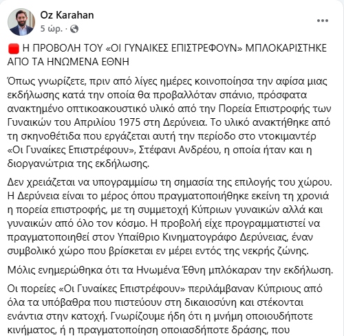Γράφει συγκεκριμένα ο Οζ Καραχάν: «Όταν οι τουρκικές κατοχικές δυνάμεις χτίζουν γήπεδα, κατασκευάζουν δρόμους, μετακινούν καθημερινά τη γραμμή κατάπαυσης του πυρός, καταλαμβάνουν περισσότερο έδαφος, επιτίθενται σε πολίτες και αγρότες ή ακόμη και συνθλίβουν οχήματα των Ηνωμένων Εθνών με μπουλντόζες δεν παρατηρείται καμία ευαισθησία από πλευράς ΟΗΕ. Όταν όμως Κύπριοι πολίτες επιδιώκουν να πραγματοποιήσουν μια προβολή ταινίας 20–25 λεπτών σε χώρο που δημιουργήθηκε ακριβώς γι’ αυτό τον σκοπό, τότε ξαφνικά πρέπει να επιδειχθεί εξουσία και ισχύς».