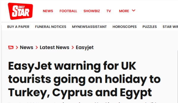 Κάποια άλλα ΜΜΕ, με αφορμή τη δήλωση του διευθύνοντα συμβούλου της Easy Jet πως λόγω της κρίσης στη Μέση Ανατολή παρατηρήθηκε επιβράδυνση των κρατήσεων για καλοκαιρινές διακοπές σε Κύπρο, Αίγυπτο και Τουρκία, τιτλοφόρησαν δημοσιεύματά τους ως εξής: «Προειδοποίηση της EasyJet για τους Βρετανούς τουρίστες που πηγαίνουν διακοπές σε Τουρκία, Κύπρο και Αίγυπτο».