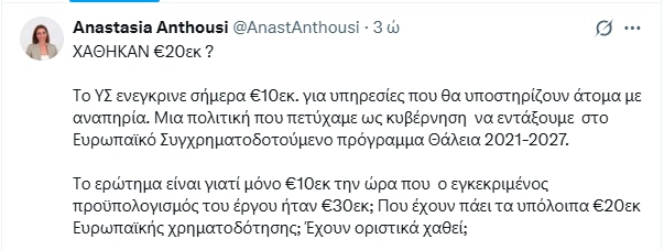 Η Αναστασία Ανθούση, υφυπουργός επί διακυβέρνησης Νίκου Αναστασιάδη (Ιούλιος 2021 – Φεβρουάριος 2023), σε ανάρτησή της στο X.com διερωτήθηκε γιατί μόνο 10 εκατομμύρια ευρώ. Όπως σημείωσε, ο εγκεκριμένος προϋπολογισμός, επί των ημερών της προηγούμενης κυβέρνησης ήταν στα 30 εκατομμύρια ευρώ.