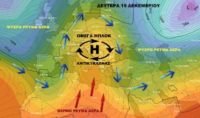 "Σχηματισμός ωμέγα μπλοκ φέρνει ένα γρήγορο πέρασμα τοπικών βροχών Δευτέρα 15 Δεκεμβρίου με πτώση θερμοκρασίας. Υπάρχει εμποδισμός του ρεύματος αέρα ερχόμενο από τα δυτικά τον Αντλαντικό προς ανατολικά με αποτέλεσμα να ανηφορίζει βορειότερα και ακολούθως να κατηφορίζει από τα βορειοανατολικά του Αντικυκλώνα σχηματίζοντας το γράμμα Ωμέγα. Πέφτει η θερμοκρασία αλλά ακόμα δεν είναι τόσο ευνοική ώστε να φέρει και κάποια ιδιαίτερη χιονόπτωση στον Όλυμπο. Οριακά αν θα καταφέρει μεσημβρινές ώρες Δευτέρας για παροδική χιονόπτωση πάνω ψηλά στον Όλυμπο", ανέφερε ο κ. Ιεροδιακόνου.