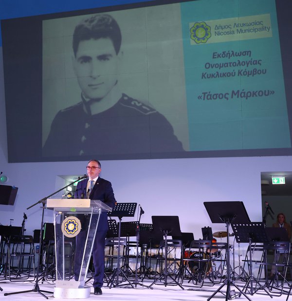 Στο κατάμεστο αμφιθέατρο του Αγίου Δομετίου, πραγματοποιήθηκε στις 24 Απριλίου 2026, η ονοματοδοσία του κυκλικού κόμβου Έγκωμης – Αγίου Δομετίου σε «Τάσος Μάρκου» στην παρουσία του Υπουργού Εσωτερικών Κωσταντίνου Ιωάννου.