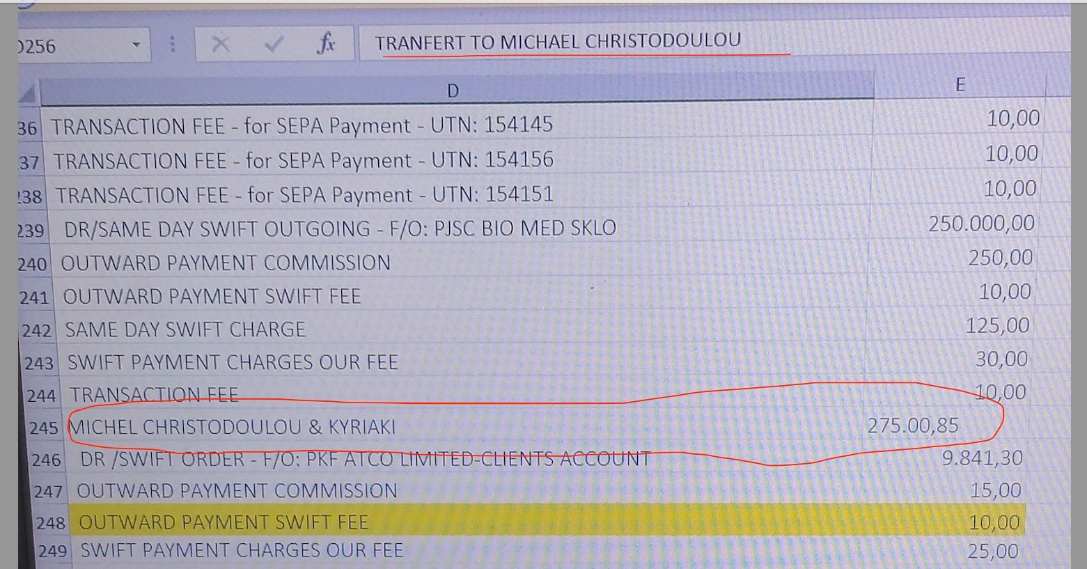 Σε μια άλλη φωτογραφία της ανάρτησής του εμφανίζεται μια τραπεζική συναλλαγή η οποία όμως έχει ορθογραφικά λάθη και δεν θυμίζει καθόλου πρόγραμμα τράπεζας. Όπως επιβεβαιώνεται και από επικοινωνία που είχαμε με τράπεζες, η συγκεκριμένη εικόνα είναι από ένα excel file και έχει γραμμένα με λανθασμένο τρόπο τις λέξεις transfer (το γράφει ως TRANSFERT) ενώ το όνομα που αποδίδεται στον τέως δικαστή του Ανωτάτου Μιχαλάκη Χριστοδούλου αναγράφεται επίσης λανθασμένα. Σε μια περίπτωση αναγράφεται ως MICHAEL CHRISTODOULOU και στην άλλη ως Μισέλ Χριστοδούλου και Κυριακή (MICHEL CHRISTODOULOU & KYRIAKI). Όπου Κυριακή υποτίθεται πως είναι η αναφερόμενη ως "Σάντη". Επιπλέον στην κατάσταση που αποδίδεται σε τραπεζικό ίδρυμα δεν αναφέρεται ούτε όνομα τράπεζας ούτε κάποια ημερομηνία.