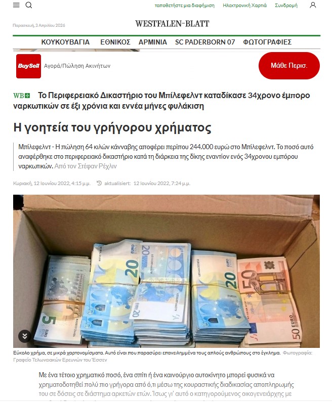 Πιο κάτω η φωτογραφία που δημοσιεύτηκε σε γερμανική ιστοσελίδα με ημερομηνία 12 Ιουνίου 2022. Η φωτογραφία οθόνης από την γερμανική ιστοσελίδα είναι μεταφρασμένη από την google στα ελληνικά για καλύτερη κατανόηση του κειμένου. Όπως αναφέρεται στο άρθρο αφορά καταδίκη και ναρκωτικά και στη λεζάντα γράφει ότι η φωτογραφία δόθηκε από το τελωνείο του Έσσεν: