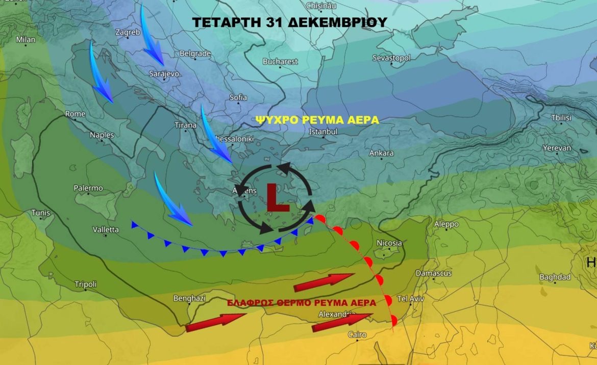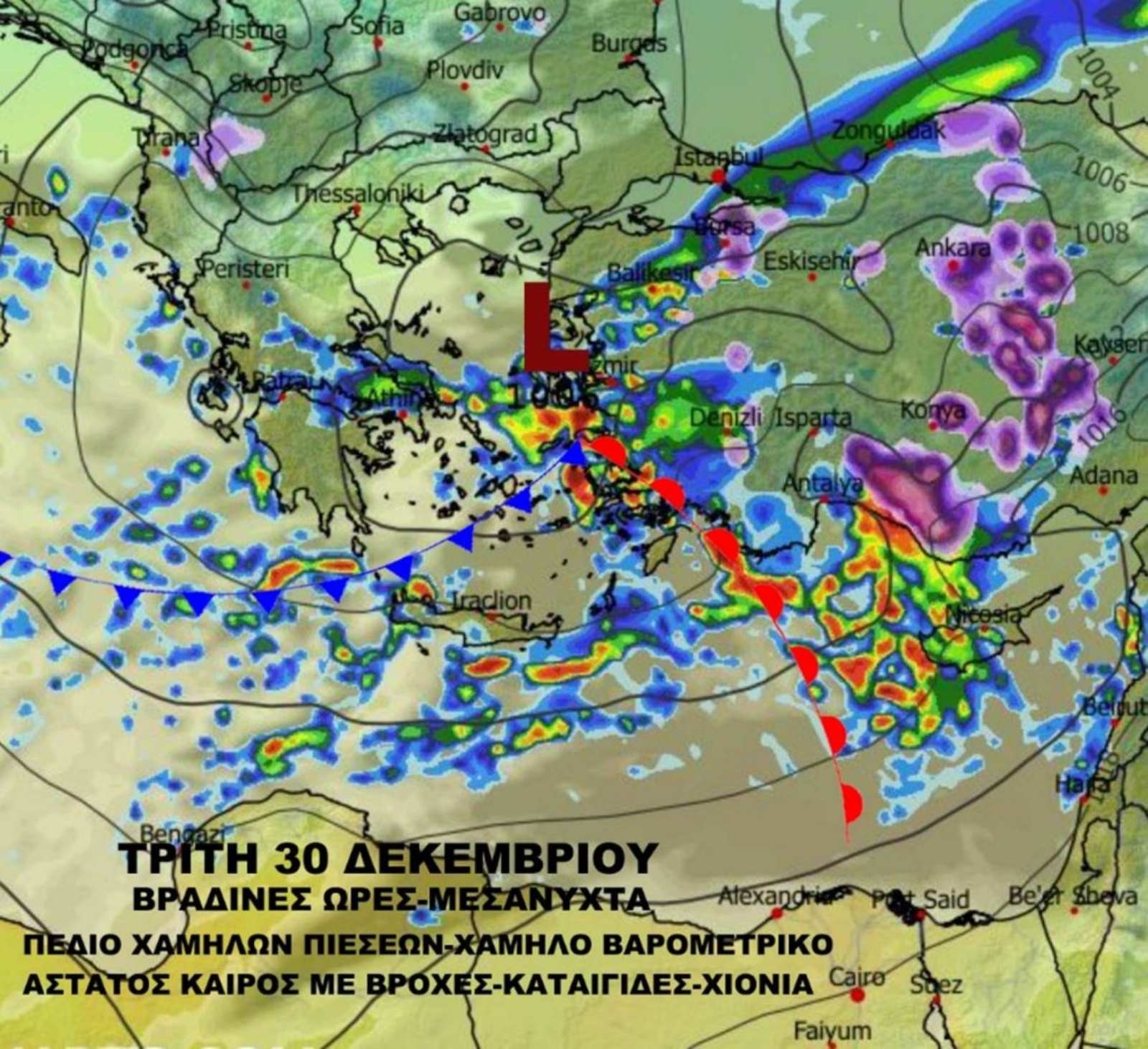 Χαμηλό βαρομετρικό με μέτωπα κακοκαιρίας θερμό και ψυχρό μέτωπο θα αρχίσει να επηρεάζει την περιοχή μας από αργά το βράδυ Τρίτης 30/12 προς Τετάρτη-Παραμονή Πρωτοχρονιάς αλλά και κατά την διάρκεια της Τετάρτης με την ημέρα της Πρωτοχρονιάς 1 Ιανουαρίου να φαίνεται να βελτιώνεται σημαντικά αφού το χαμηλό βαρομετρικό φεύγει πιο ανατολικά. Ένα χαμηλό βαρομετρικό που φέρνει βροχές σε όλη την Κύπρο, τοπικές καταιγίδες με ηλεκτρική δραστηριότητα, μικρού μεγέθους χαλάζι μέσα από καταιγίδες, αρκετές ποσότητες βροχής τοπικά αλλά και χιόνια στον Όλυμπο. Πέραν όμως αυτών αναμένεται να έχουμε κατά περιόδους και ισχυρό πεδίο ανέμων.