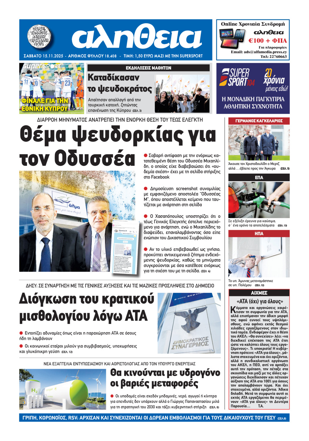 Σε σημερινό πρωτοσέλιδο της η εφημερίδα Αλήθεια γράφει "Θέμα ψευδορκίας για τον Οδυσσέα - Διαρροή μηνύματος ανατρέπει την ένορκη θέση του τέως Γενικού Ελεγκτή".