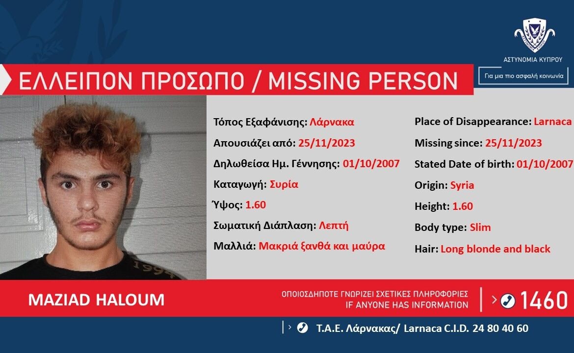 Πρόκειται για τον Maziad Haloum, 16 ετών, από Συρία, ο οποίος ελλείπει από τον χώρο διαμονής του, στη Λάρνακα, από το πρωί της 25ης Νοεμβρίου, 2023.