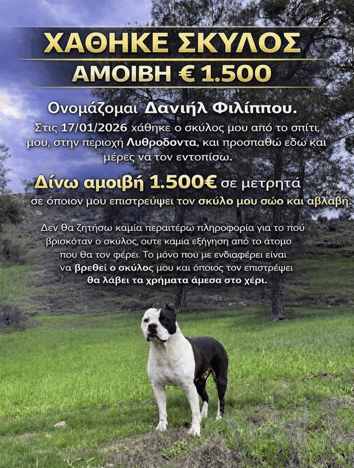 Ο εν λόγω σκύλος χάθηκε στον Λυθροδόντα από την οικία του ιδιοκτήτη του στις 17 Ιανουαρίου 2026.