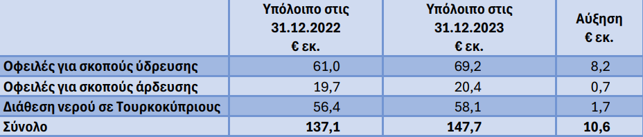 Τα εισπρακτέα ποσά του ΤΑΥ από διάφορα σχέδια ύδρευσης και άρδευσης, ανήλθαν, στις 31.12.2023 στα €147,7 εκατ. σε σύγκριση με €137,1εκ. στις 31.12.2022, δηλαδή σημειώθηκε αύξηση ύψους €10,6εκ. ή ποσοστό 7,7%. Αυτό οφείλεται κυρίως στην αύξηση των εισπρακτέων ποσών από την πώληση νερού ύδρευσης, ύψους €8,2εκ., από τα οποία τα €4,8εκ. προκύπτουν από την αύξηση των οφειλών των Αρχών Τοπικής Αυτοδιοίκησης και της αξίας του νερού που διατέθηκε σε Τουρκοκύπριους καταναλωτές στις κατεχόμενες περιοχές της Λευκωσίας, Αμμοχώστου, Πύλας και Μελούσιας, ύψους €1,7εκ.