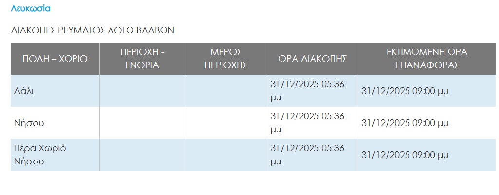 Στο σκοτάδι βρίσκονται σήμερα παραμονή Πρωτοχρονιάς, περιοχές στη Λευκωσία με εκτιμώμενη ώρα επαναφοράς της ηλεκτροδότησης, τις 9:00 το βράδυ.