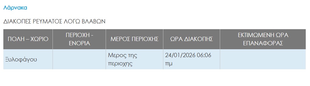 Προβλήματα σημειώνονται στην ηλεκτροδότηση σε αρκετές περιοχές στην επαρχία Λάρνακας, Λεμεσού καθώς και στην επαρχία Αμμοχώστου από τις πρώτες πρωινές ώρες του Σαββάτου (24/1).