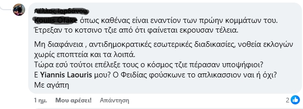Επικριτικός για την Άμεση Δημοκρατία παρουσιάστηκε και ένας πολίτης που μέχρι πρότινος, την υποστήρζε. Ερωτηθείς γιατί στράφηκε εναντίον του κόμματος ενώ είχε θέσει υποψηφιότητα, απάντησε μεταξύ άλλων: «Μη διαφάνεια, αντιδημοκρατικές εσωτερικές διαδικασίες, νοθεία εκλογών χωρίς εποπτεία και τα λοιπά. Γιάννης Λαούρης μου, ο Φειδίας φούσκωνε το application ναι ή όχι;».
