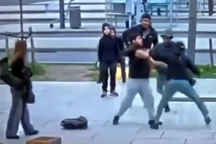 Ξαφνικά, ένας από τους νεαρούς τον γρονθοκοπεί στο πρόσωπο. Ο νεαρός προσπαθεί να αντιδράσει, όμως ένας από τους δράστες τον σηκώνει στον αέρα και τον πετά με δύναμη στο πεζοδρόμιο. Παρά το γεγονός ότι μετά το χτύπημα φαίνεται ανήμπορος να αντισταθεί, η ομάδα συνεχίζει να τον χτυπά επανειλημμένα.