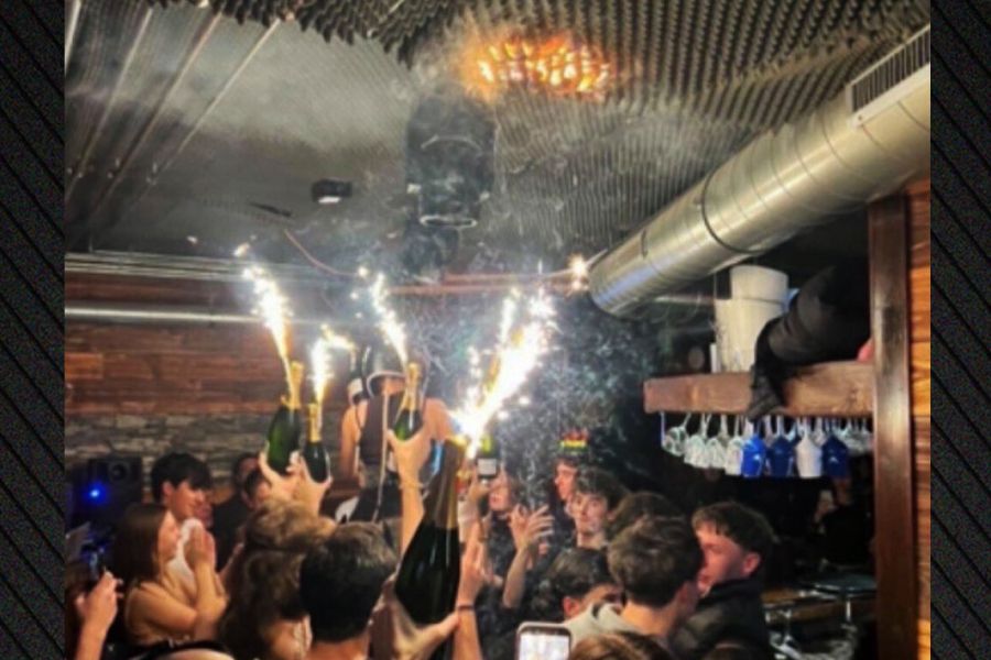 Σύμφωνα με μαρτυρίες από το Κραν Μοντανά, λίγο πριν πιάσει φωτιά η οροφή του υπογείου, μέλος του προσωπικού εμφανίστηκε κρατώντας μπουκάλια σαμπάνιας με αναμμένα πυροτεχνικά «συντριβάνια». Βίντεο που κυκλοφόρησε στα social media δείχνει νεαρό να προσπαθεί να σβήσει τις πρώτες φλόγες με το μπλουζάκι του, ενώ η μουσική συνεχίζει να παίζει και αρκετοί τραβούν βίντεο αντί να απομακρυνθούν.
