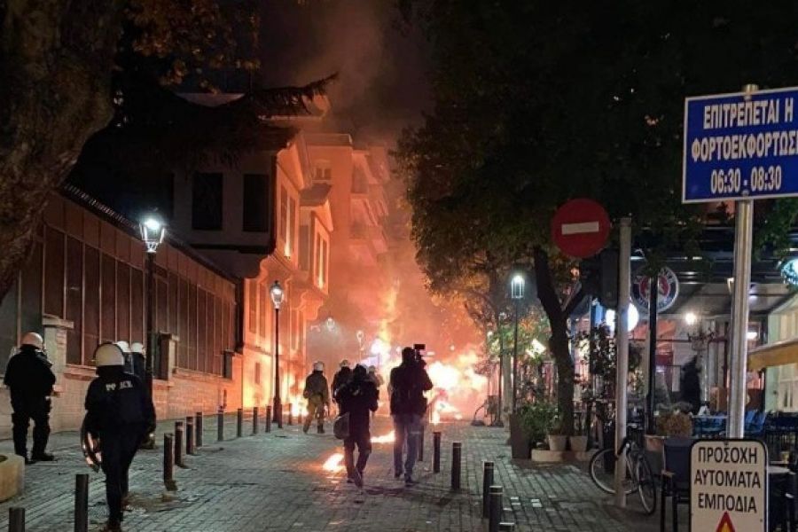 Στο ύψος του τουρκικού προξενείου, στην οδό Αποστόλου Παύλου, ομάδα ατόμων επιτέθηκε με μολότοφ και φωτοβολίδες εναντίον των αστυνομικών δυνάμεων, οι οποίες απάντησαν με χειροβομβίδες κρότου-λάμψης και χημικά. Στη συνέχεια, το σκηνικό της έντασης μεταφέρθηκε στην οδό Ολυμπιάδος. Έχουν προκληθεί ζημιές σε σταθμευμένα ΙΧ, ενώ οχήματα της Πυροσβεστικής Υπηρεσίας σπεύδουν στο σημείο για να σβήσουν τις φωτιές σε κάδους απορριμμάτων. Το θωρακισμένο όχημα εκτόξευσης νερού(αύρα) της Αστυνομίας που βρίσκεται στο σημείο συμμετέχει στις προσπάθειες κατάσβεσης.