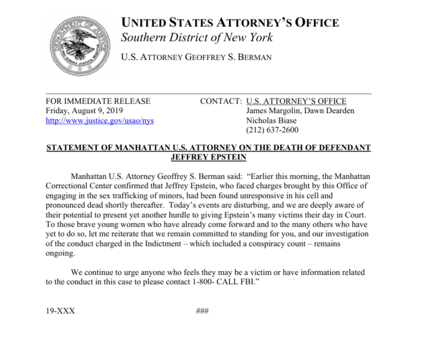 Η δήλωση αποδίδεται στον τότε εισαγγελέα των ΗΠΑ στο Μανχάταν, Τζέφρι Σ. Μπέρμαν, και τιτλοφορείται «Δήλωση του Εισαγγελέα των ΗΠΑ του Μανχάταν σχετικά με τον θάνατο του κατηγορουμένου Τζέφρι Έπστιν».
