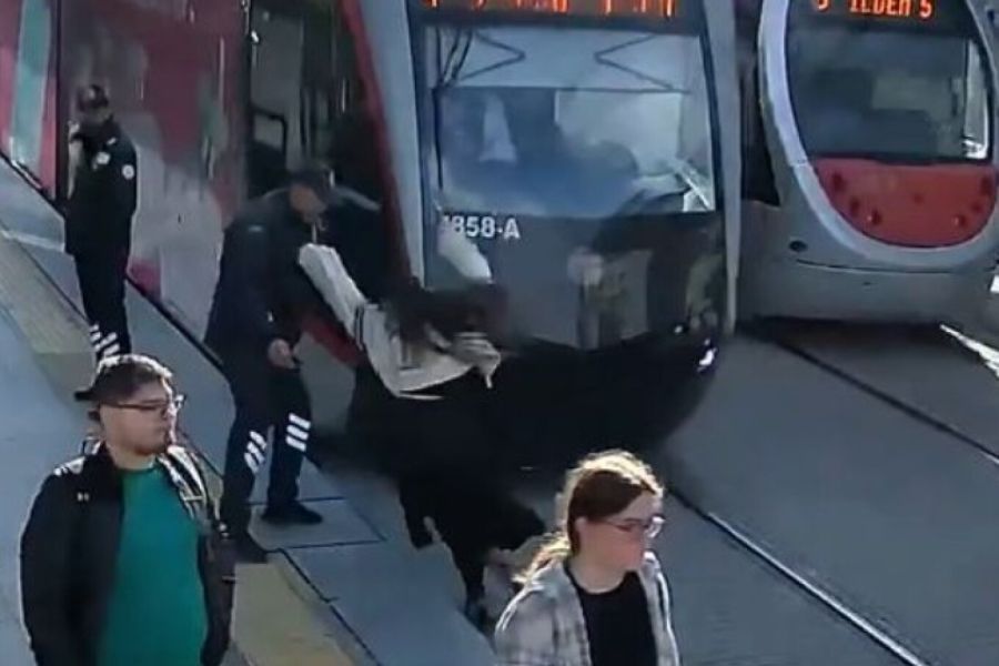 Στην Καισάρεια, στο κέντρο της Τουρκίας, μια νεαρή γυναίκα που φορούσε ακουστικά σώθηκε την τελευταία στιγμή όταν φύλακας ασφαλείας την τράβηξε από τις ράγες πριν τη χτυπήσει το τραμ.