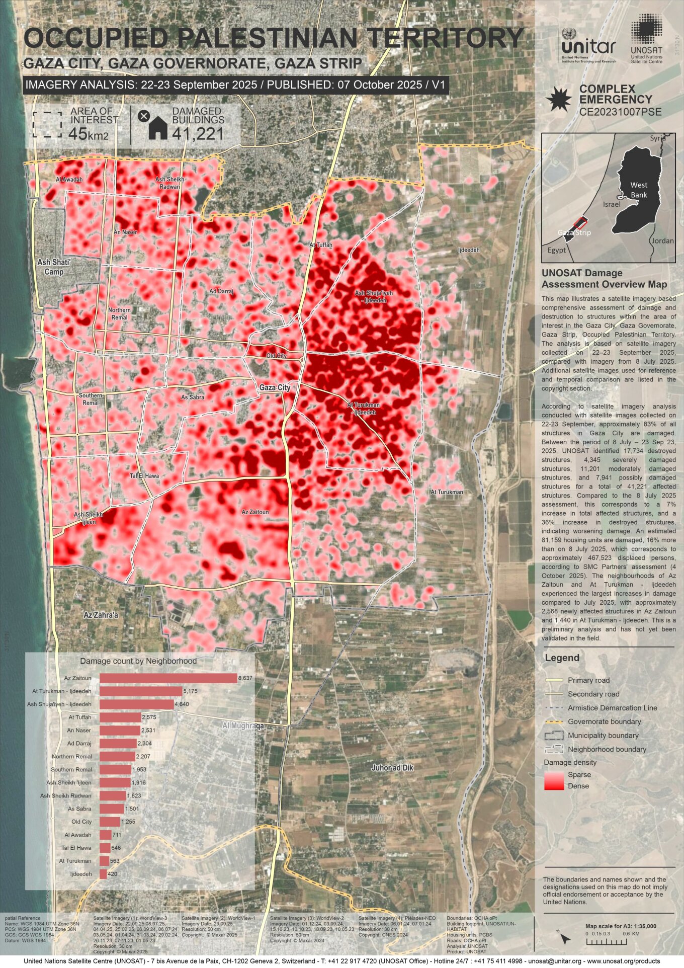 Σε μια αξιολόγηση εικόνων από τις 22-23 Σεπτεμβρίου της πόλης της Γάζας, ο οργανισμός του ΟΗΕ εκτιμά ότι ένα ακόμη υψηλότερο ποσοστό — 83% — των κτιρίων εκεί είχε υποστεί ζημιές ή καταστραφεί.
