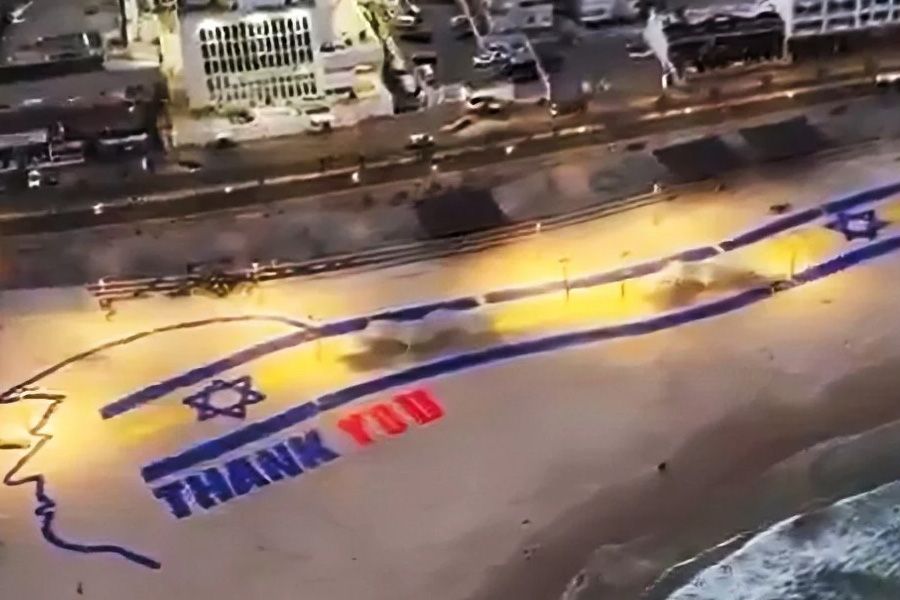 Ένα τεράστιο πανό που ευχαριστεί τον Ντόναλντ Τραμπ δεσπόζει από το πρωί της Δευτέρας (13/10) στην παραλία του Τελ Αβίβ, ανήμερα της απελευθέρωσης των Ισραηλινών ομήρων από τη Χαμάς, μετά από δύο χρόνια πολέμου.