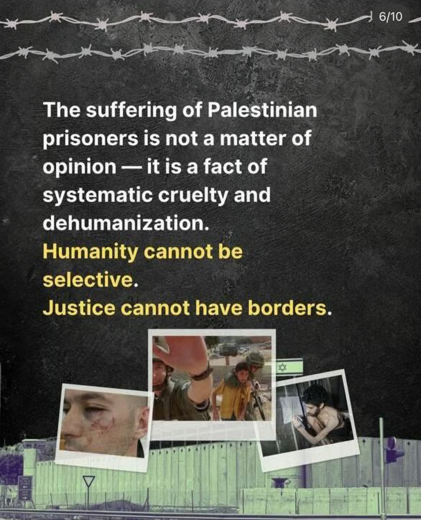 Στο κείμενο της δημοσίευσης γίνεται λόγος για «σκληρότητα και απανθρωποποίηση» σε βάρος Παλαιστινίων κρατουμένων, τονίζοντας ότι «η ανθρωπιά δεν μπορεί να είναι επιλεκτική» και πως «η δικαιοσύνη δεν μπορεί να γνωρίζει σύνορα». Ωστόσο, ανάμεσα στις εικόνες υπήρχε και φωτογραφία του 24χρονου Ισραηλινού ομήρου σε άθλια κατάσταση, η οποία προήλθε από βίντεο της Χαμάς.