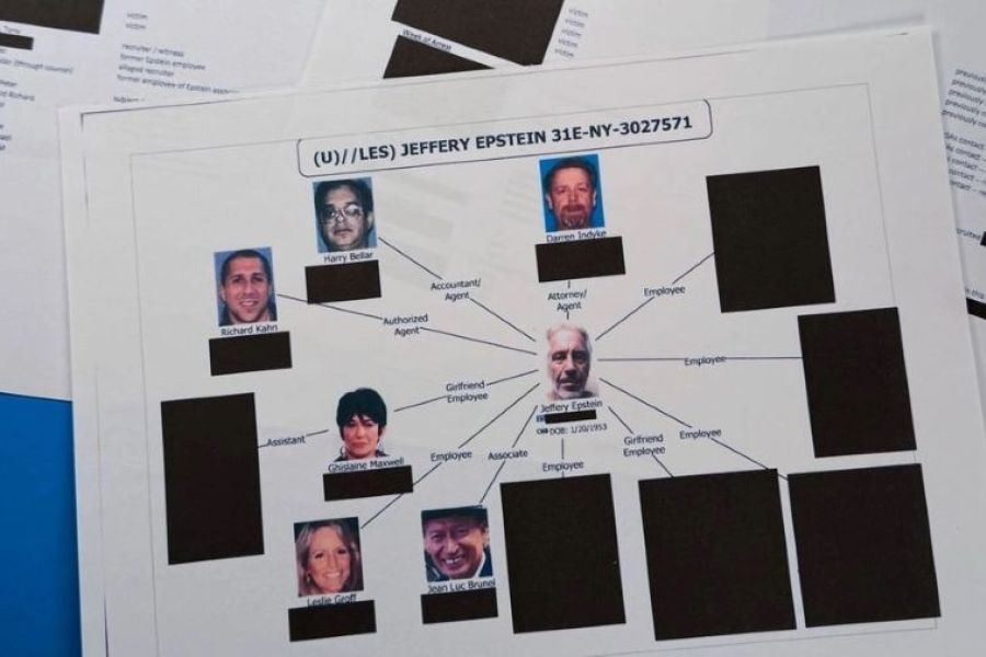 Το διάγραμμα δείχνει τα ονόματα και τις φωτογραφίες αρκετών γνωστών στενών συνεργατών του Έπσταϊν, συμπεριλαμβανομένης της καταδικασμένης συνεργάτιδας Γκισλέν Μάξγουελ και του Ζαν-Λικ Μπρουνέλ, ενός μοντέλου με μακροχρόνιους δεσμούς με τον Επστάιν, ο οποίος μάλιστα κατηγορήθηκε για βιασμό στη Γαλλία. Ο Μπρουνέλ αυτοκτόνησε σε γαλλική φυλακή το 2022.