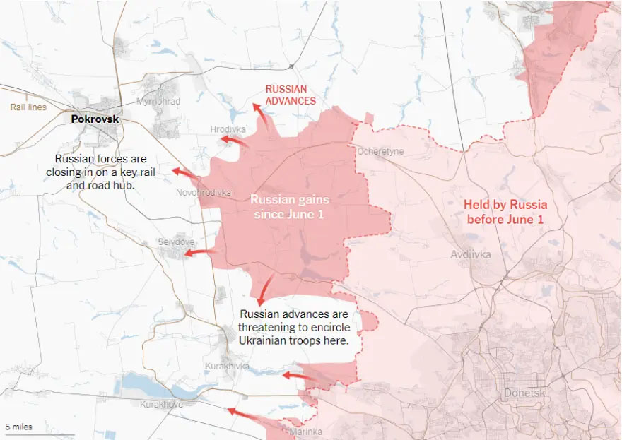 Παρότι η Ρωσία επιτέθηκε κατά μήκος σχεδόν ολόκληρης της ανατολικής γραμμής μετώπου, οι περισσότερες από τις επιθέσεις της κατέγραψαν μικρά εδαφικά κέρδη μετά από μήνες σφοδρών συγκρούσεων. Για παράδειγμα, η επίθεση προς την πόλη Τσάσιβ Γιαρ, που βρίσκεται σε υψόμετρο, έχει προχωρήσει μόλις τρία μίλια μέσα σε ένα χρόνο. Η επίθεση στο Ποκρόφσκ, ωστόσο, προχώρησε πολύ πιο γρήγορα, με την πρώτη γραμμή να κινείται γρήγορα προς τα ουκρανικά εδάφη κατά τη διάρκεια του καλοκαιριού.