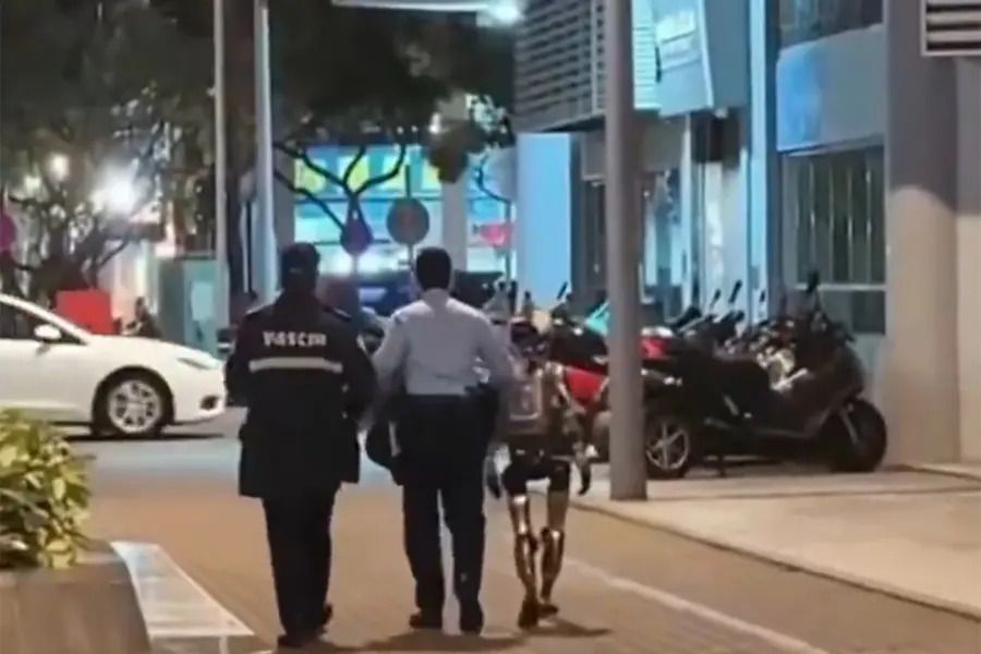 One night in Macau, a citizen was taking a walk with his humanoid robot (Unitree G1).